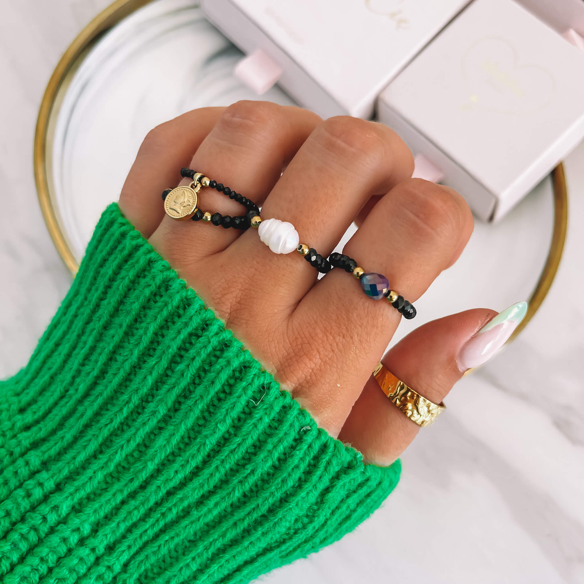 PIERŚCIONEK NA GUMCE ZE STALI CHIRURGICZNEJ CZARNE KORALIKI