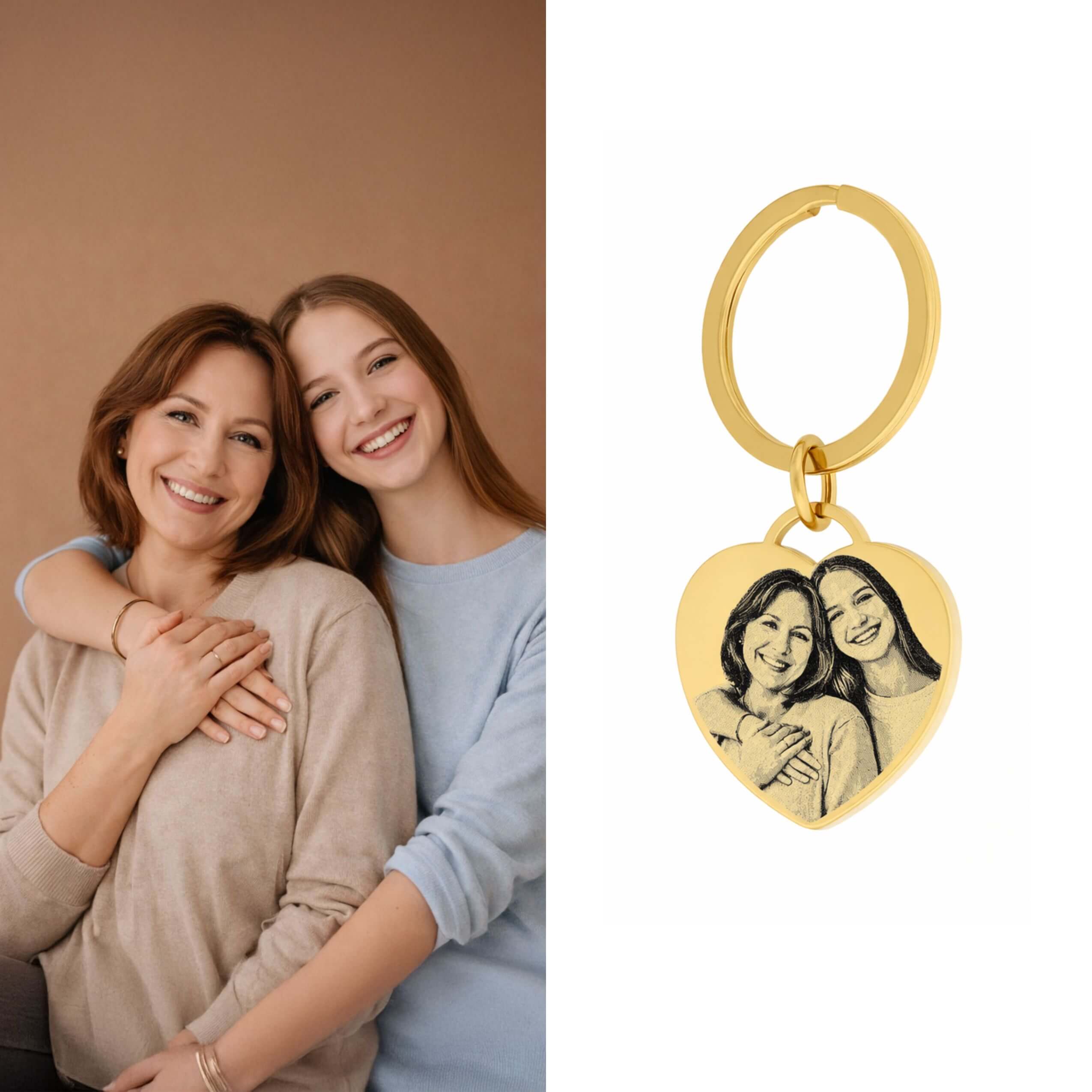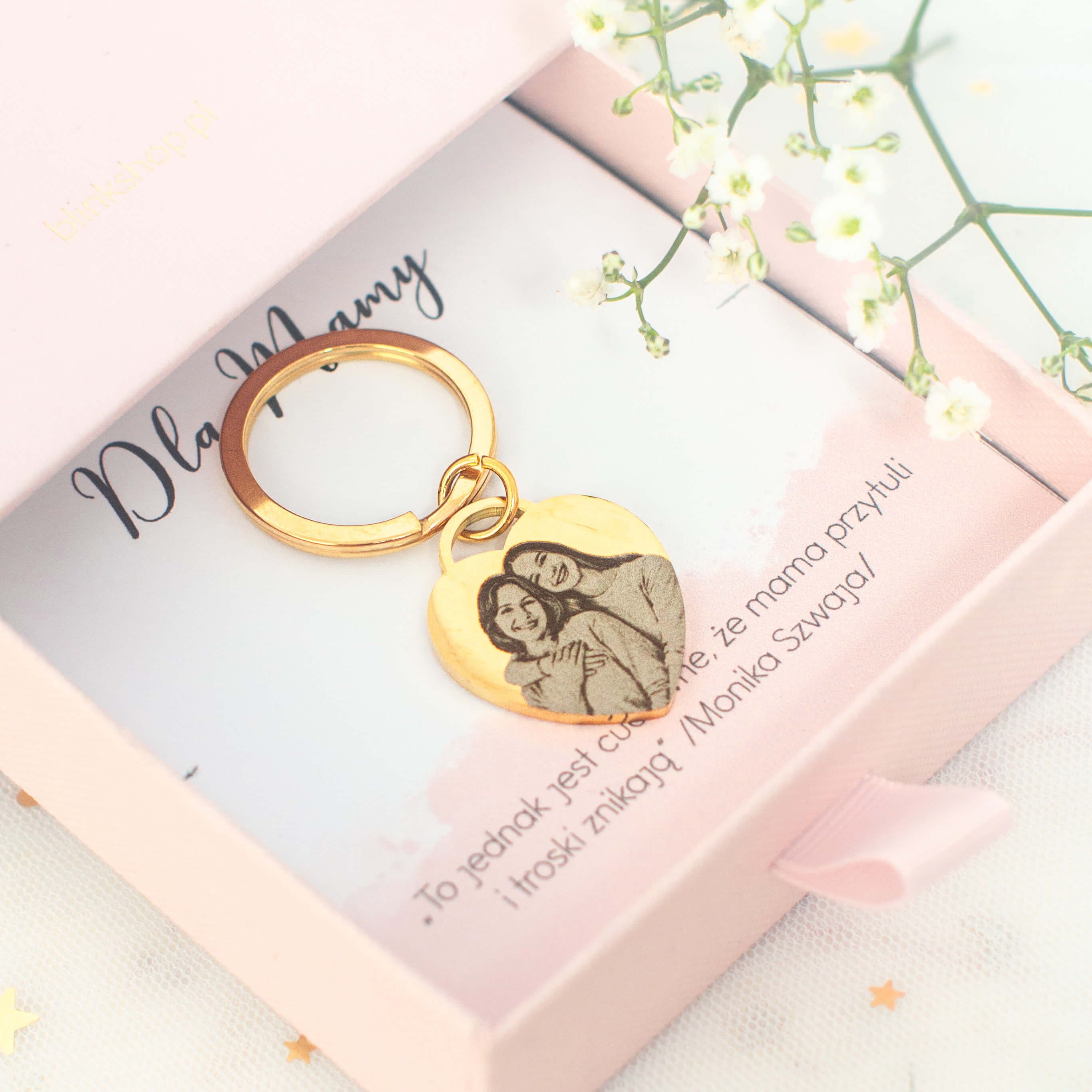 PREZENT DLA MAMY – PERSONALIZOWANY ZŁOTY BRELOK SERCE DO KLUCZY LUB TOREBKI Z GRAWEREM ZDJĘCIA