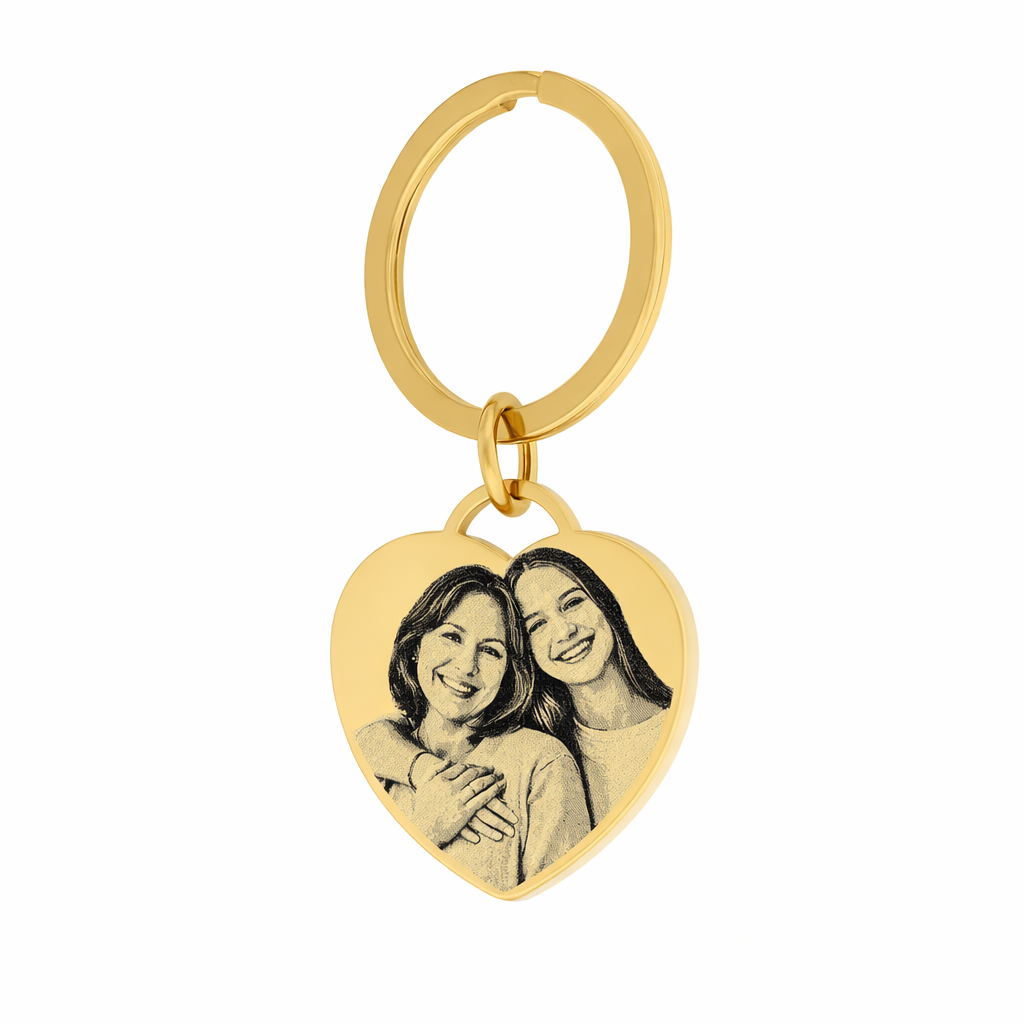 Brelok wykonany jest z wysokiej jakości stali szlachetnej 316L w eleganckim, złotym kolorze, odpornej na ścieranie i intensywne użytkowanie. Zawieszka w kształcie serca pięknie eksponuje grawer zdjęcia i doskonale prezentuje się zarówno przy kluczach, jak i przy torebce.