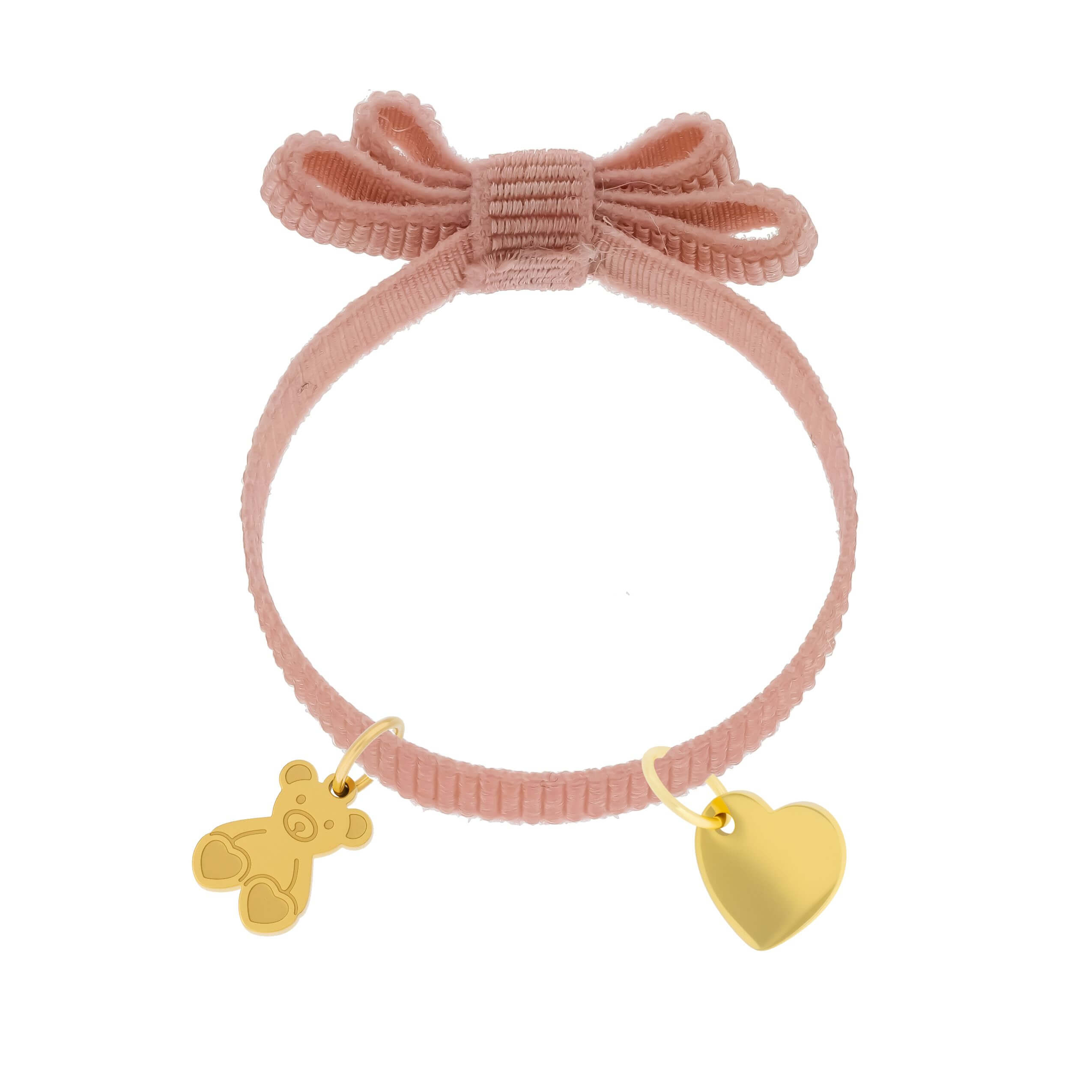 RÓŻOWA BRANSOLETKA Z KOKARDKĄ I ZŁOCONYMI ZAWIESZKAMI DLA DZIECKA PERSONALIZACJA IMIENIA NA SERCU