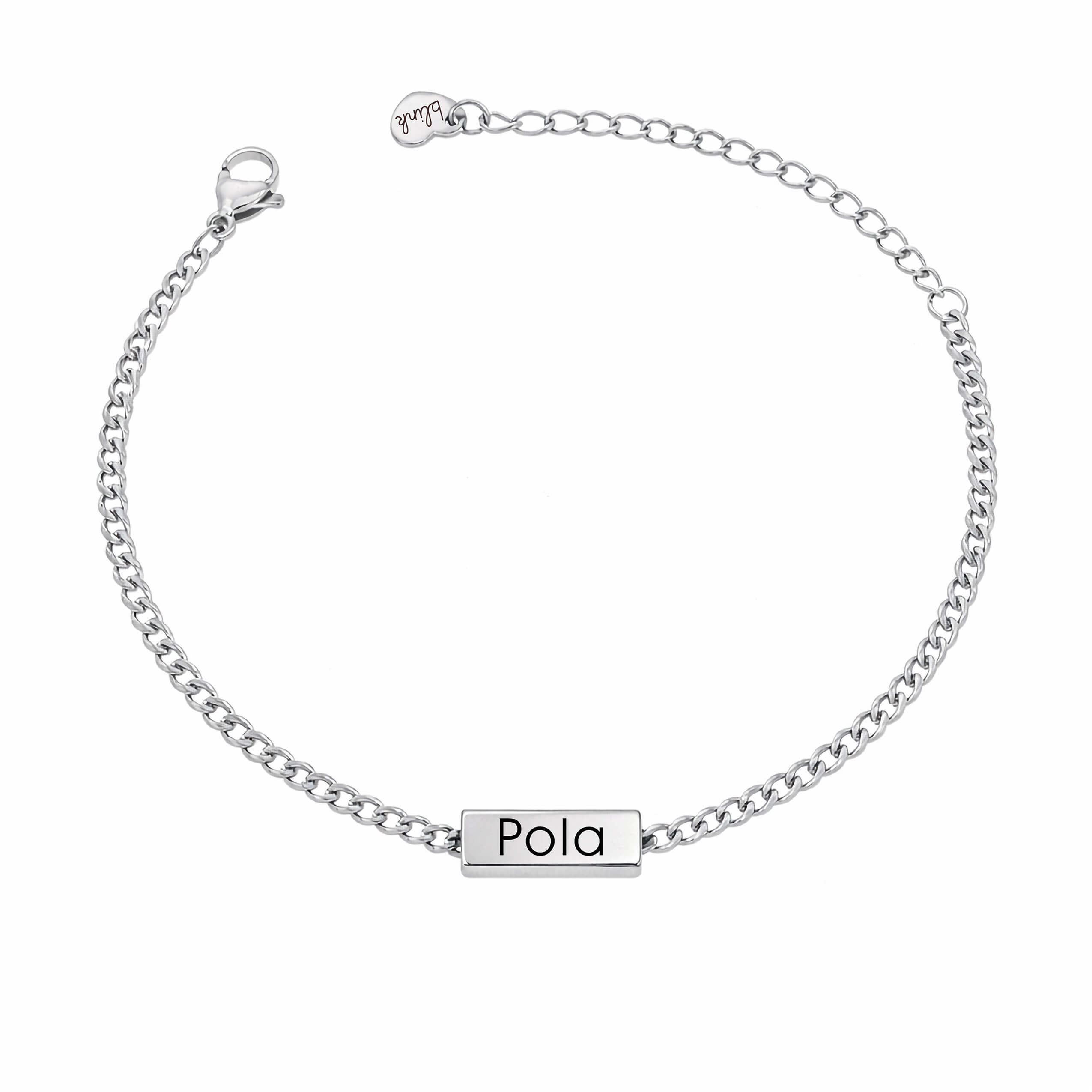 Subtelna, a jednocześnie pełna znaczenia – srebrna bransoletka z grawerem imienia to biżuteria, która zostaje z kimś na co dzień. Minimalistyczna forma sprawia, że pasuje zarówno do codziennych stylizacji, jak i eleganckich okazji. Na centralnej kostce wykonujemy precyzyjny grawer wybranego imienia lub inicjału, dzięki czemu bransoletka staje się wyjątkowo osobista. To doskonały sposób, by mieć przy sobie kogoś ważnego – dyskretnie, ale zawsze blisko.Bransoletka została wykonana z wysokiej jakości stali chirurgicznej w kolorze srebrnym, odpornej na ścieranie i codzienne użytkowanie.