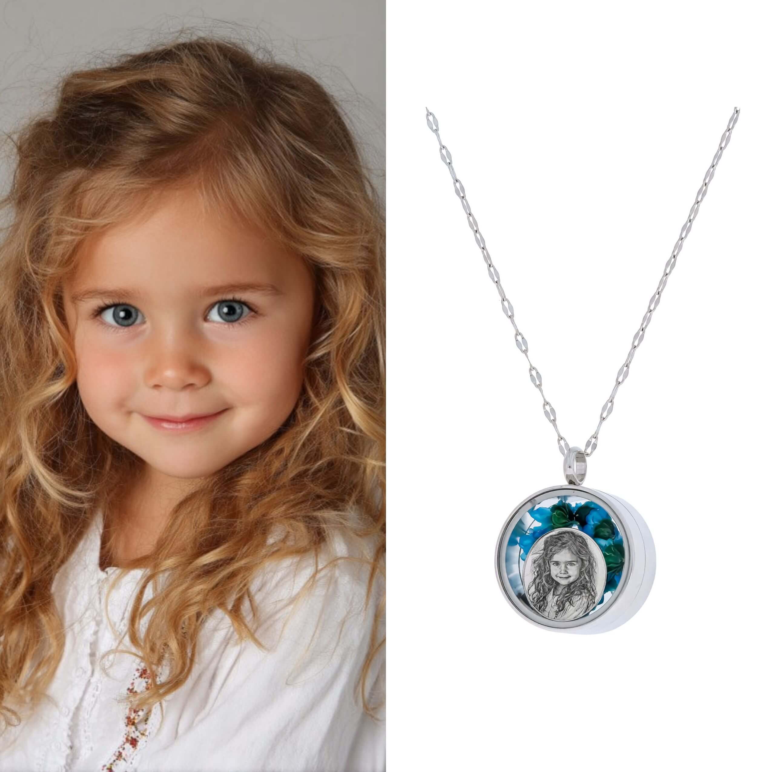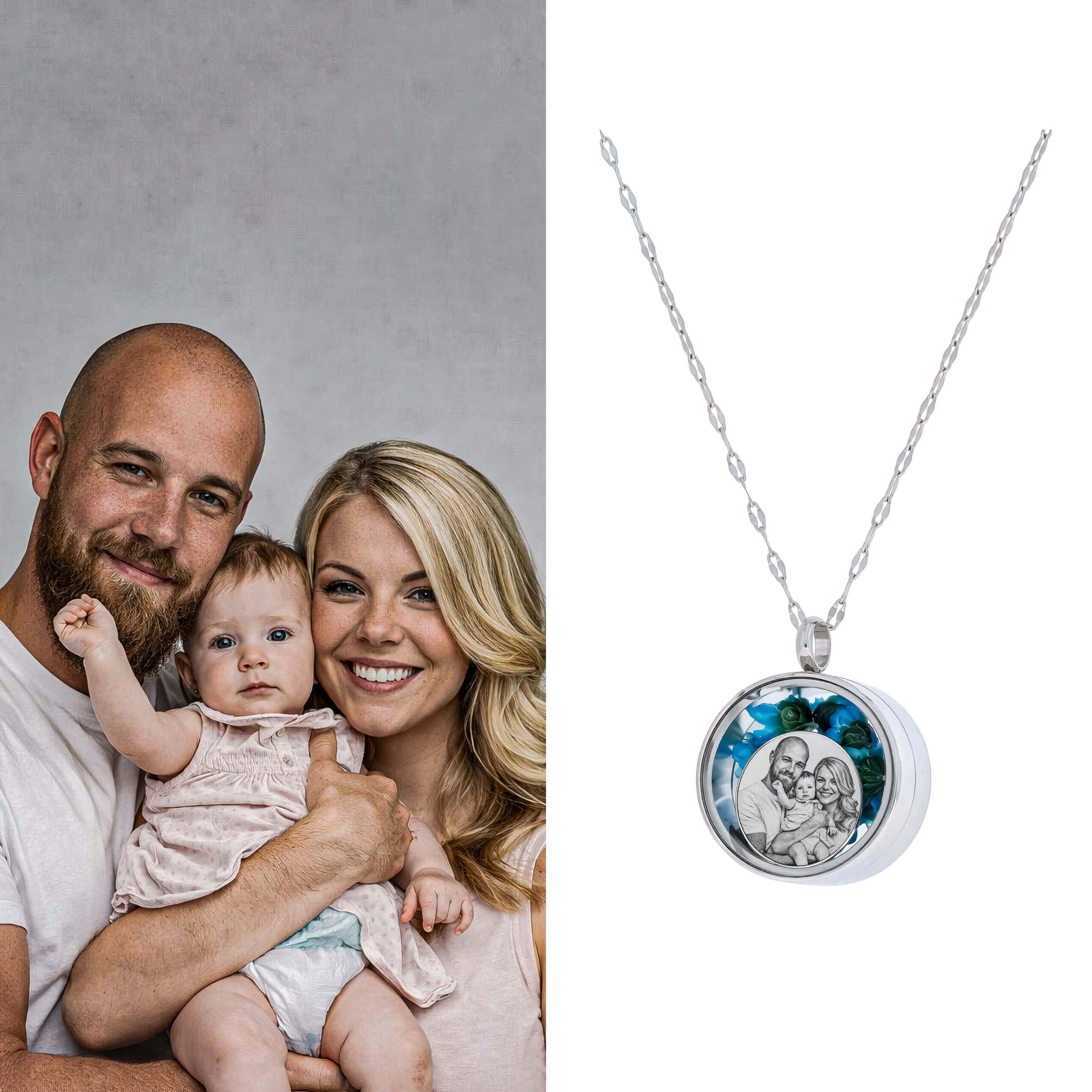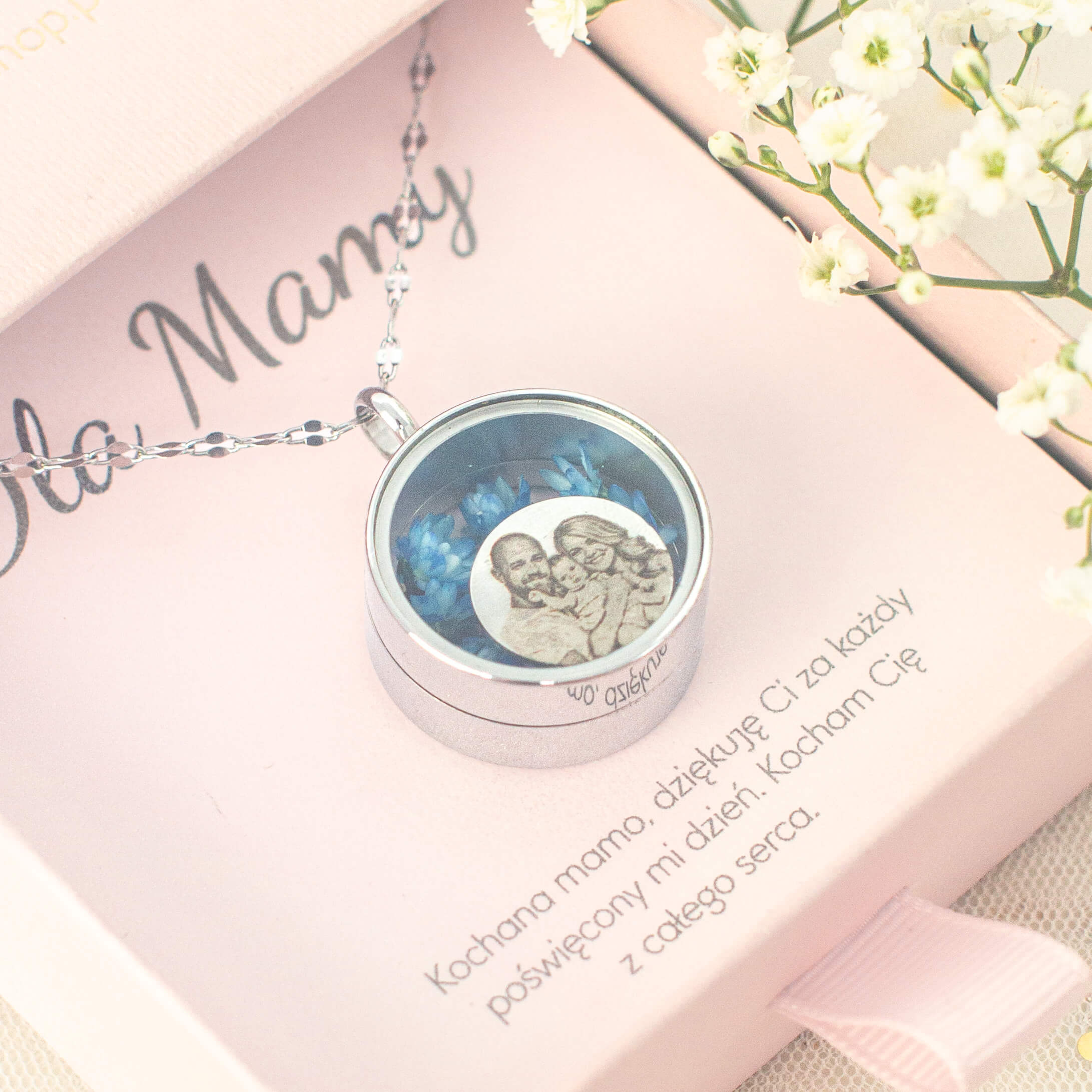 Wyjątkowy naszyjnik w formie zakręcanego sekretnika, który skrywa w sobie najpiękniejsze wspomnienia. Wewnątrz znajduje się personalizowany grawer ze zdjęcia, otoczony naturalnymi, suszonymi kwiatami gliksji, które nadają biżuterii niezwykle romantyczny i unikalny charakter.