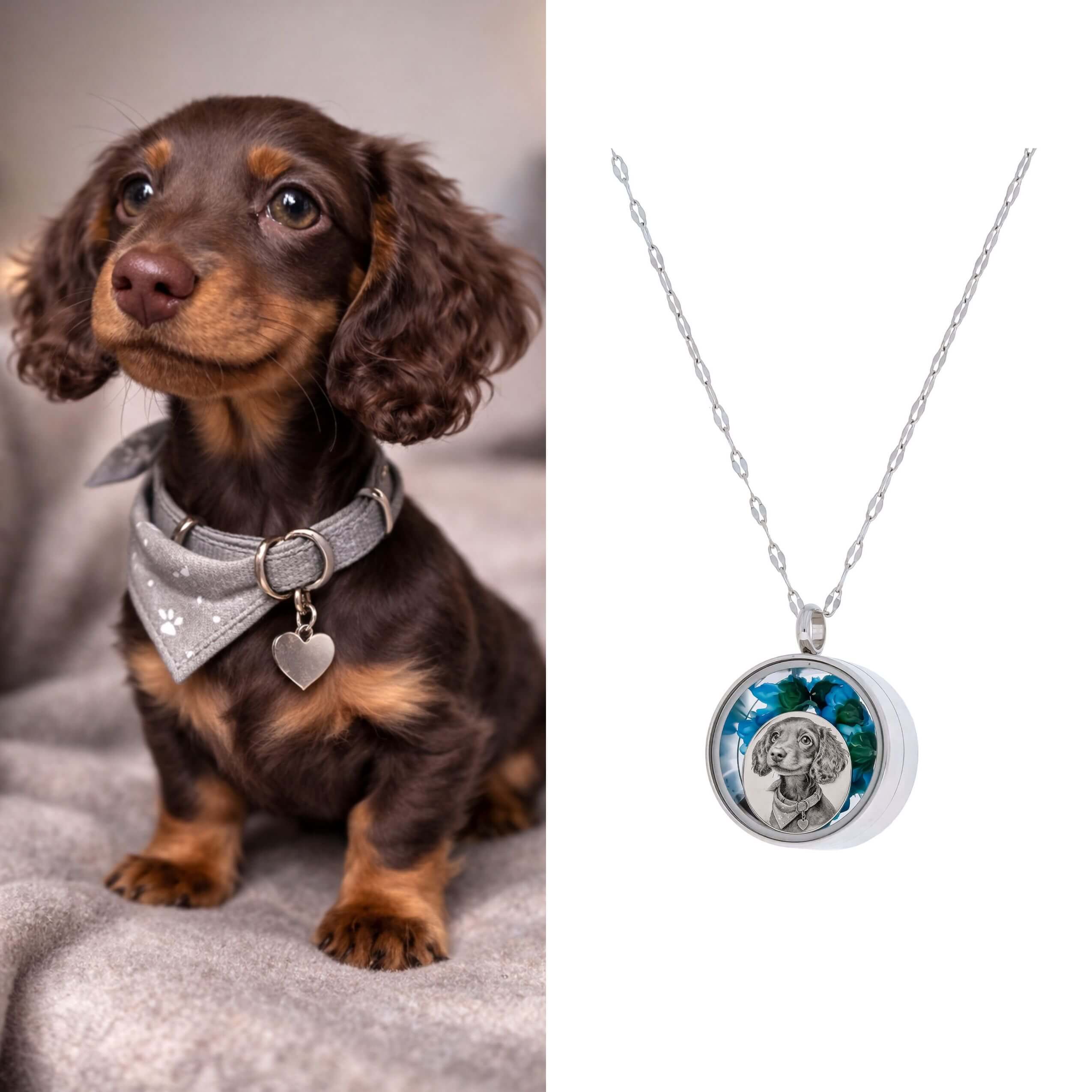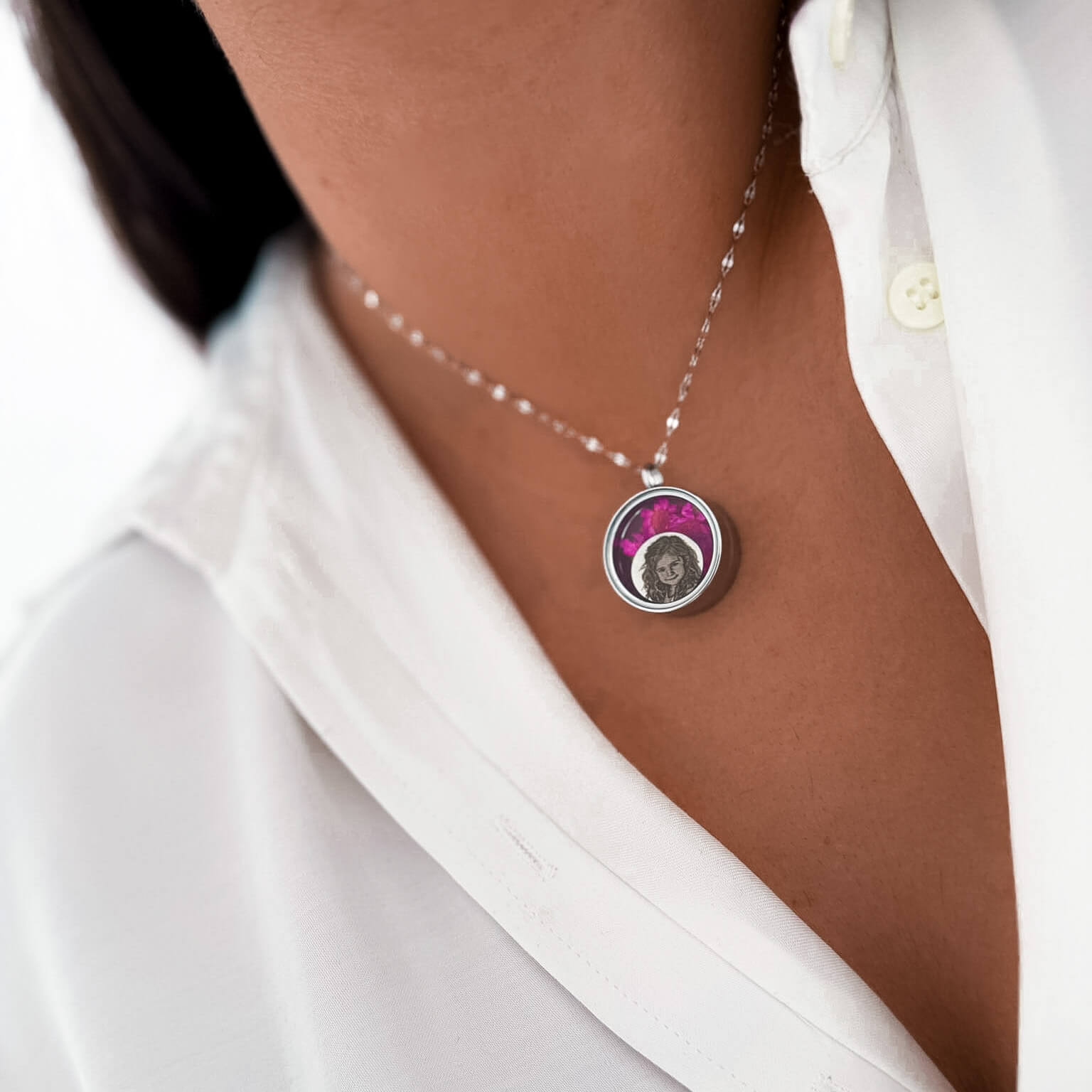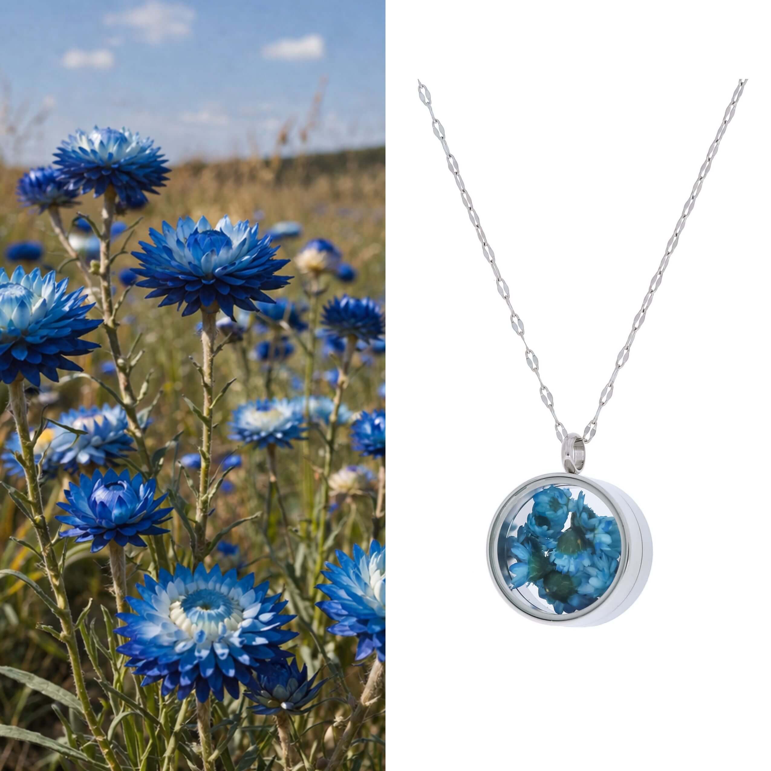 Wyjątkowy naszyjnik w formie zakręcanego sekretnika, który skrywa w sobie najpiękniejsze wspomnienia. Wewnątrz znajduje się personalizowany grawer ze zdjęcia, otoczony naturalnymi, suszonymi kwiatami gliksji, które nadają biżuterii niezwykle romantyczny i unikalny charakter.