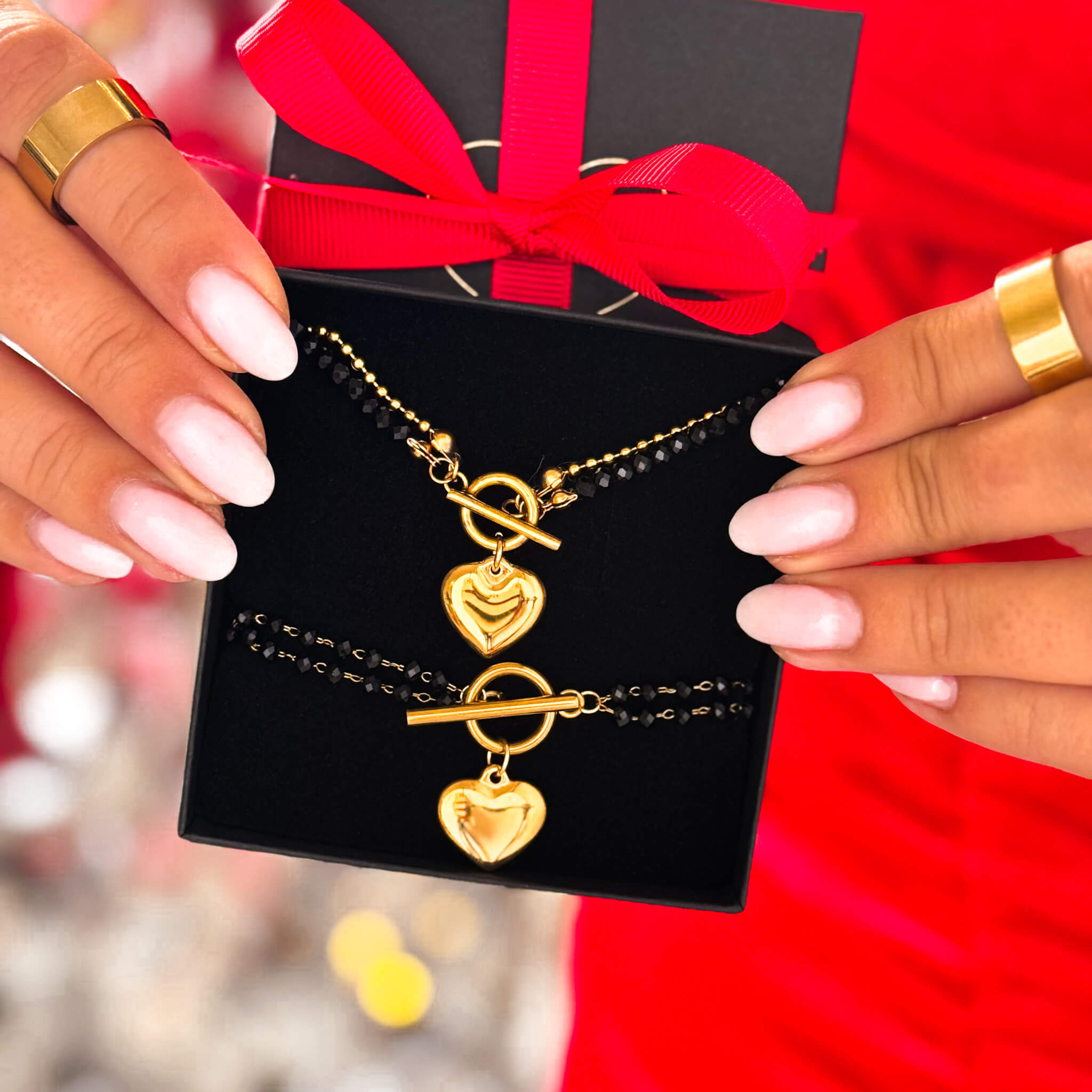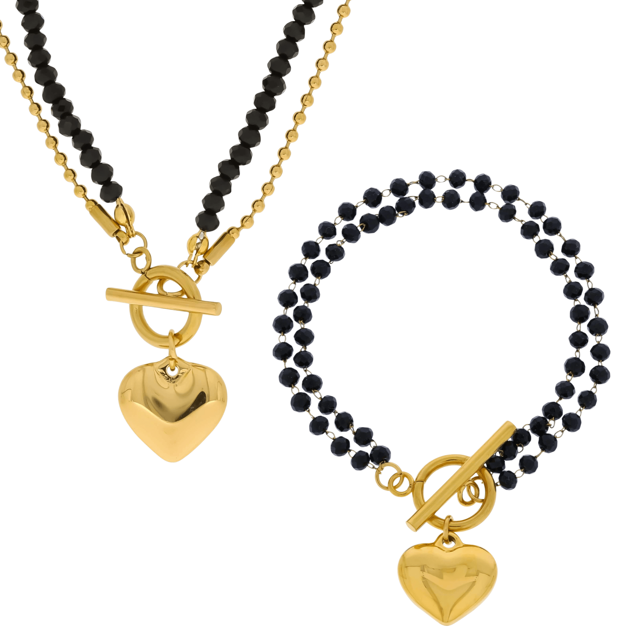 ZESTAW BIŻUTERII CZARNE KORALIKI Z SERCAMI POZŁACANA STAL CHIRURGICZNA