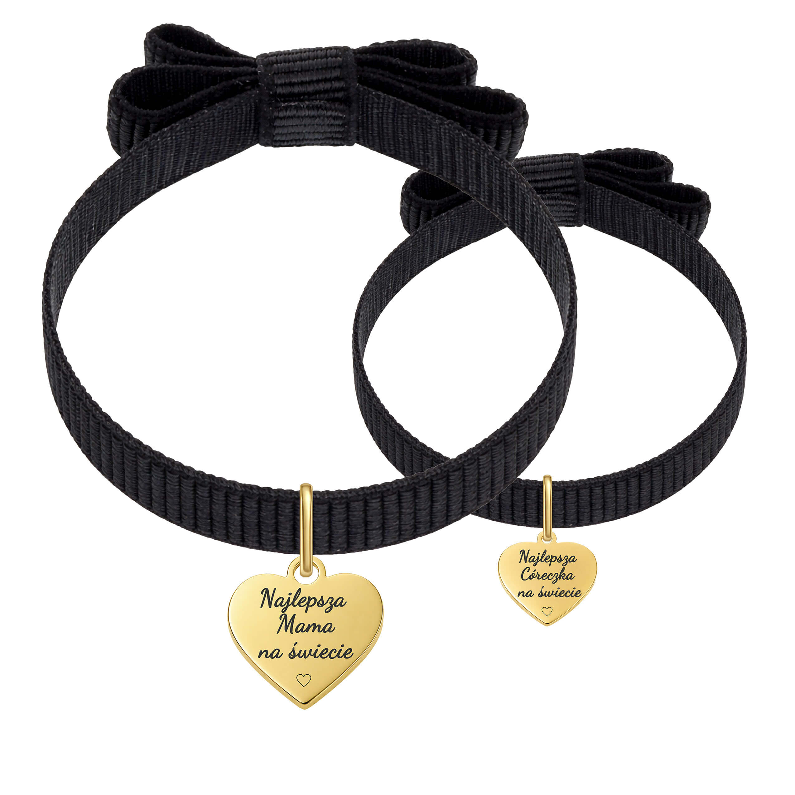 Delikatne tasiemki z kokardką oraz zawieszki w kształcie serca z grawerem „Najlepsza Mama na świecie” i „Najlepsza Córeczka na świecie” tworzą piękny komplet, który łączy na zawsze.