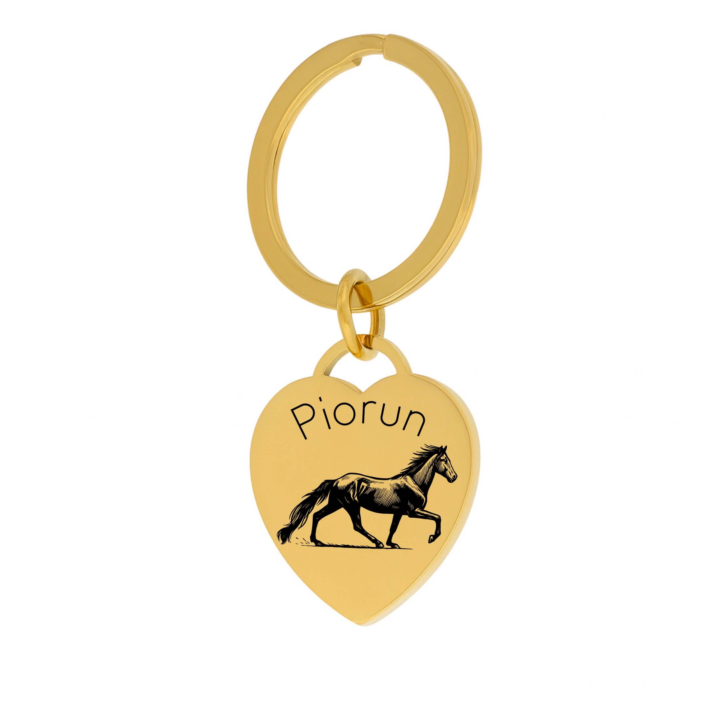 ZŁOTY BRELOK DAMSKI W KSZTAŁCIE SERCA ZE STALI CHIRURGICZNEJ 316L GRAWER Z RYSUNKIEM SZCZEGÓŁOWYM KONIA PREZENT MARZEŃ