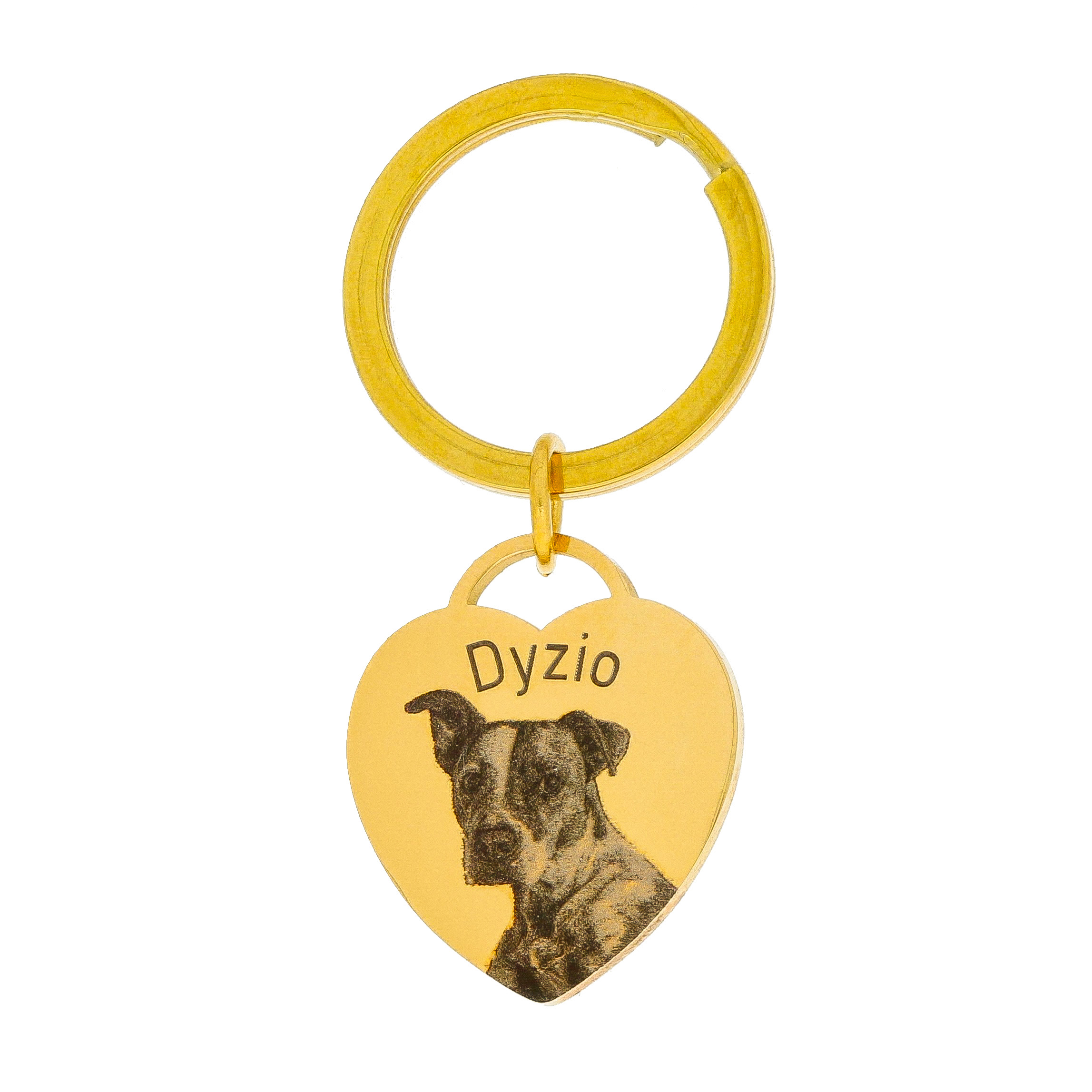 ZŁOTY BRELOK DAMSKI W KSZTAŁCIE SERCA ZE STALI CHIRURGICZNEJ 316L GRAWER Z PSEM W TECHNICE "MONEY PRINT" PREZENT MARZEŃ