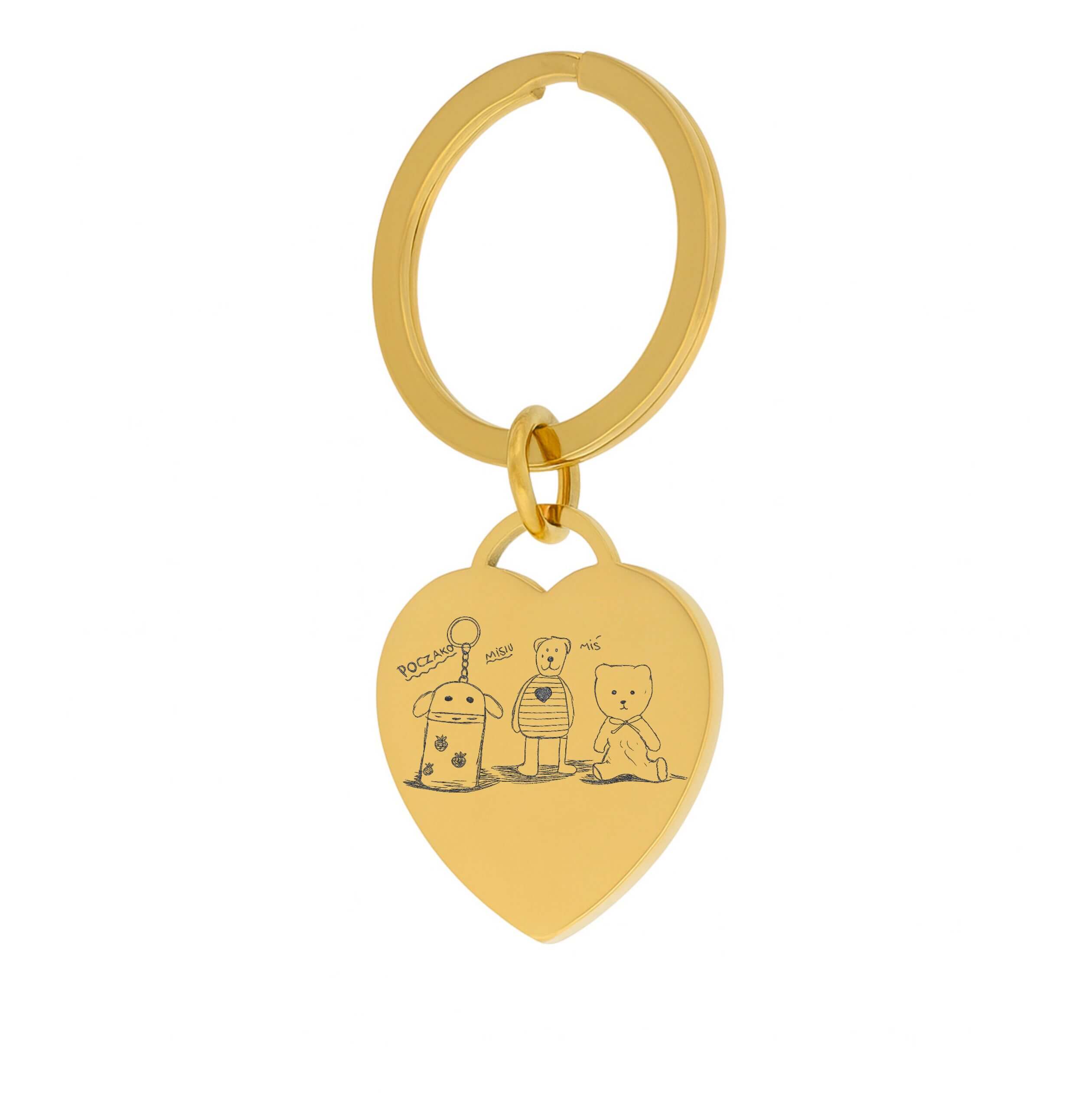 Oryginalny brelok w kształcie serca w kolorze złotym, wykonany z wysokogatunkowej stali chirurgicznej 316L o wysokim połysku. Wyjątkowy projekt tworzony w Polsce – na zawieszce w kształcie serca ręcznie wykonujemy szczegółowy grawer rysunku dziecka na podstawie przesłanego przez Ciebie zdjęcia. To wyjątkowy sposób, by docenić twórczość najmłodszych i zachować ją w formie trwałej pamiątki.