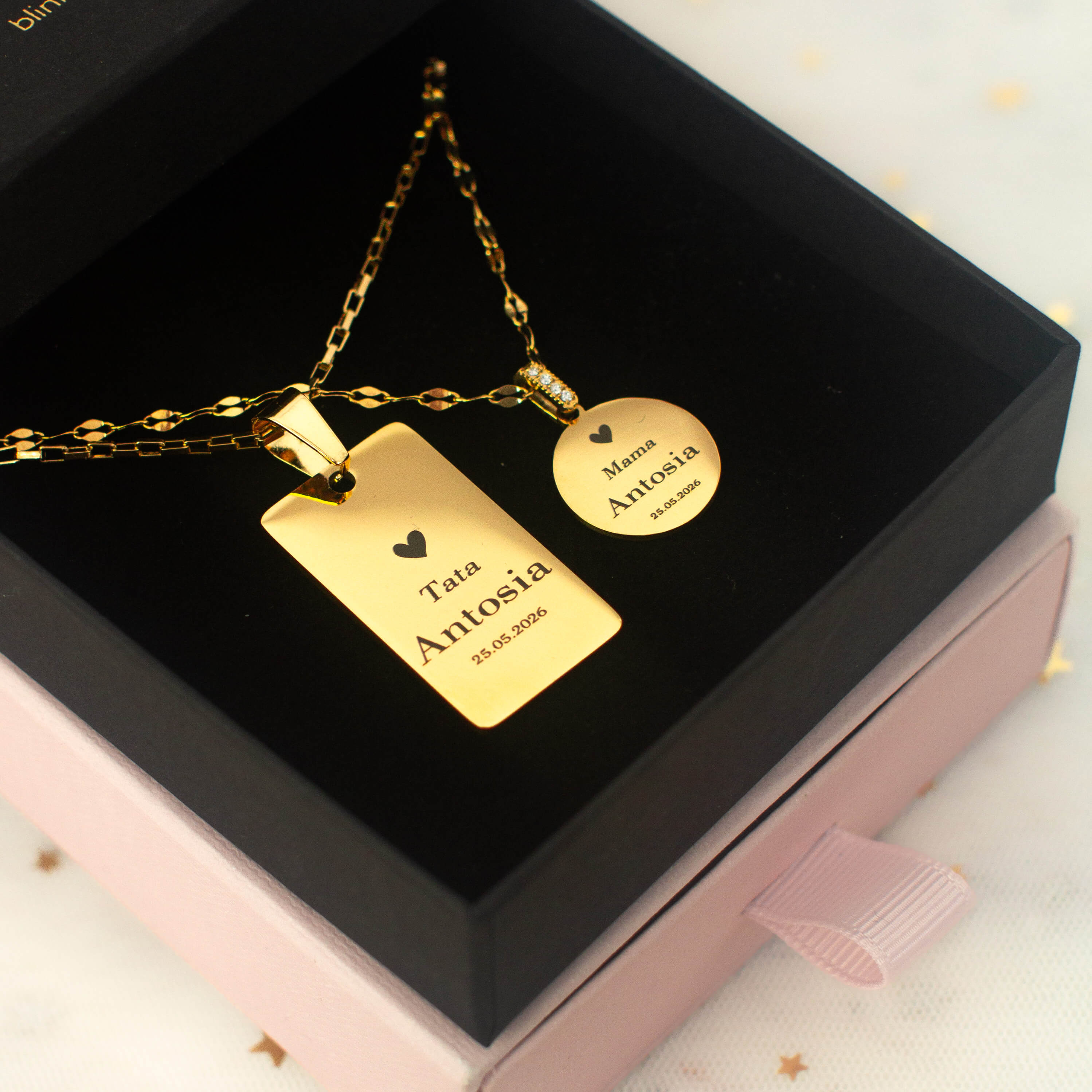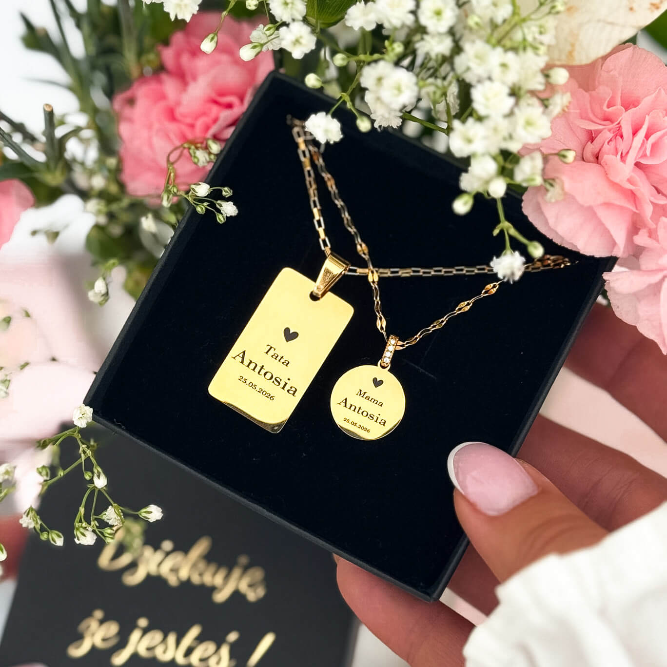 Zestaw składa się z dwóch zawieszek: subtelnej, okrągłej dla mamy oraz klasycznej, prostokątnej dla taty. Każda z nich ozdobiona jest grawerem imieniem dziecka oraz ważną datą, tworząc wyjątkową i osobistą pamiątkę na lata.